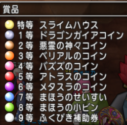 宿屋でふくびき商品リストを見てみました。スライムハウスとか特等の商品